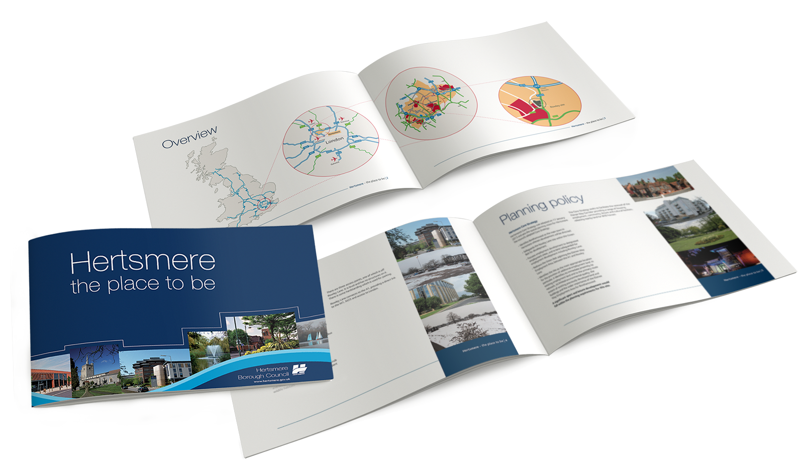 Report produced to encourage businesses to establish in Hertsmere. It includes maps of the area created in Illustrator.