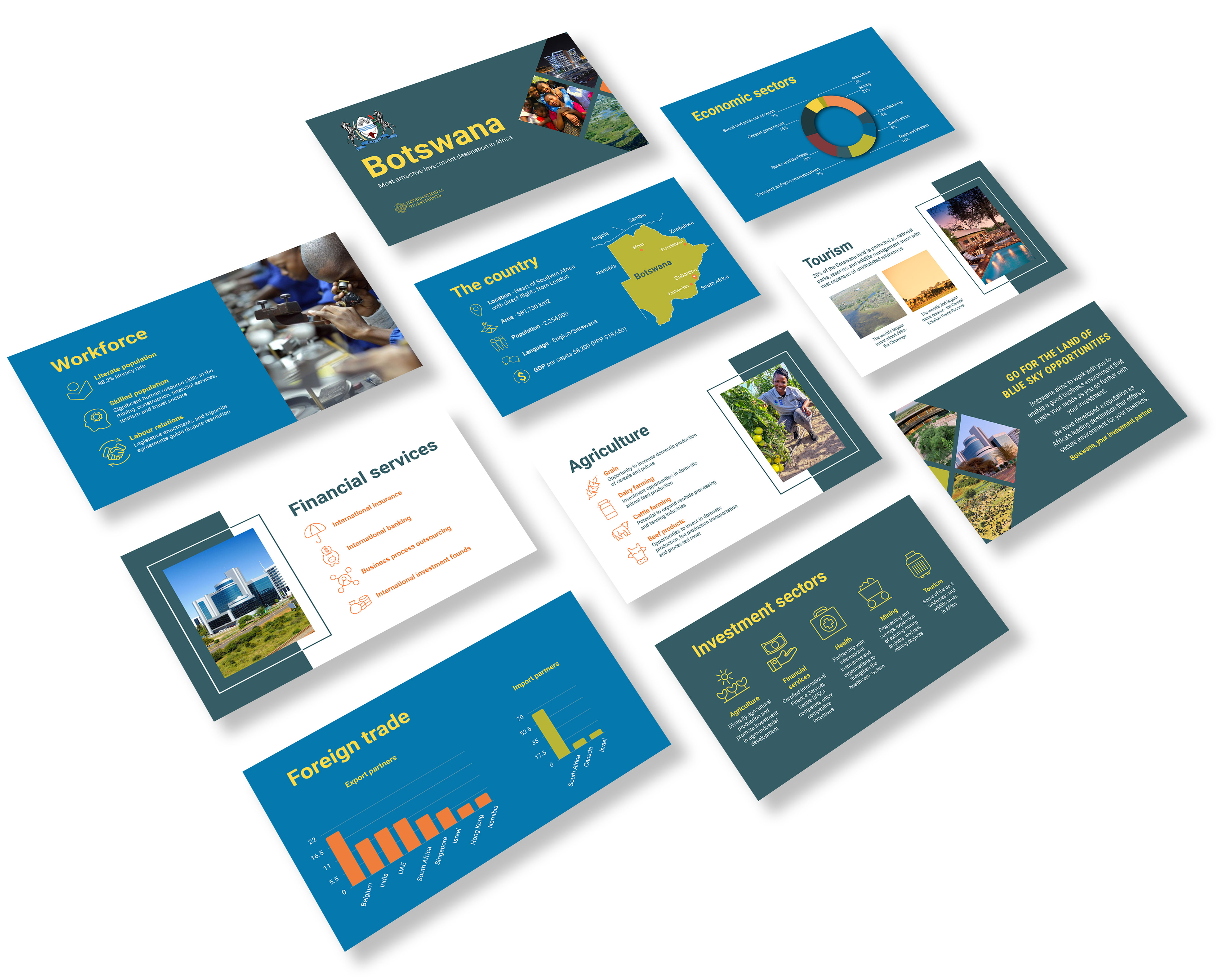 Keynote presentation to depict Botswana as an investment destination. It includes maps, charts, photographs and icons.